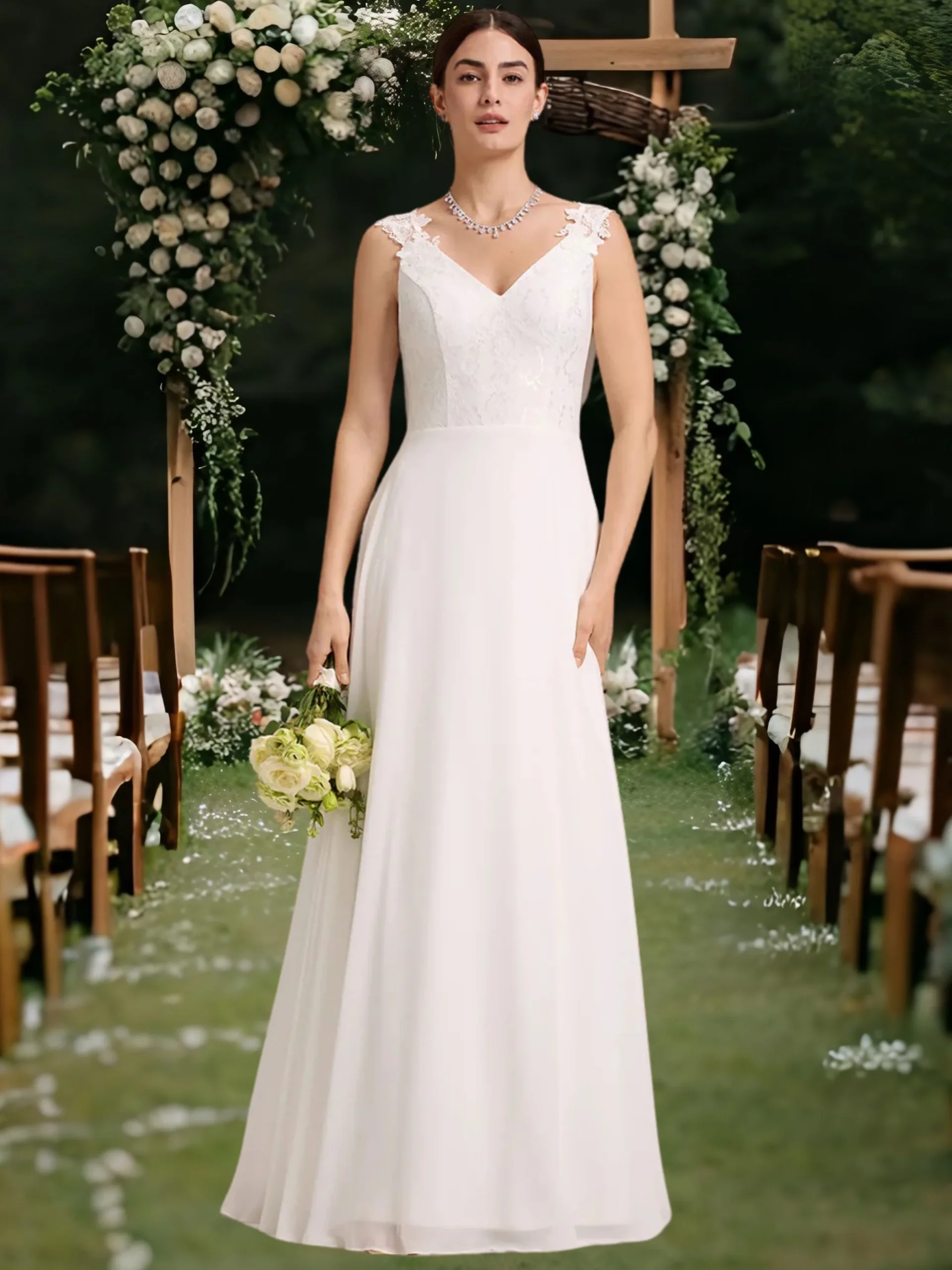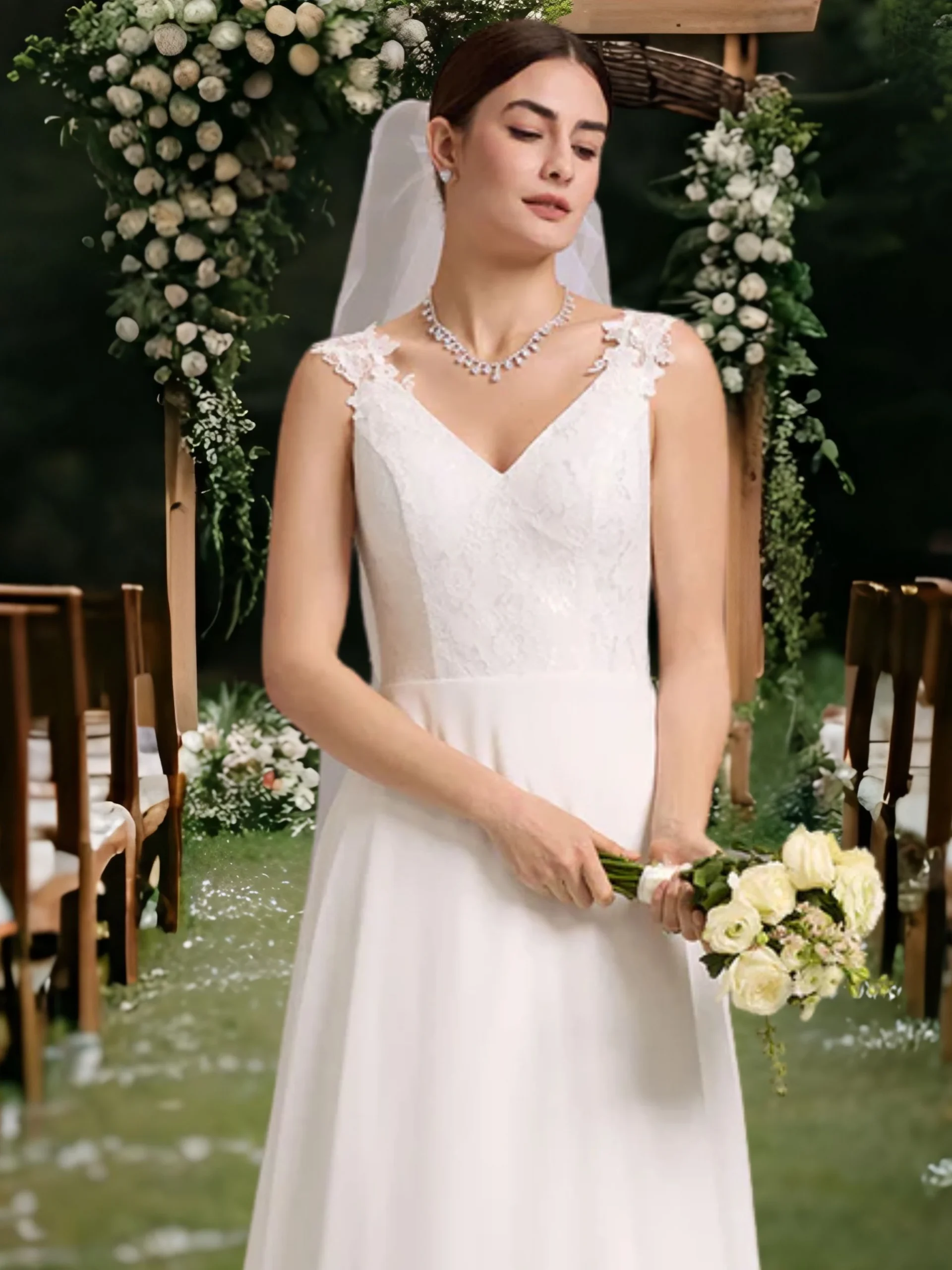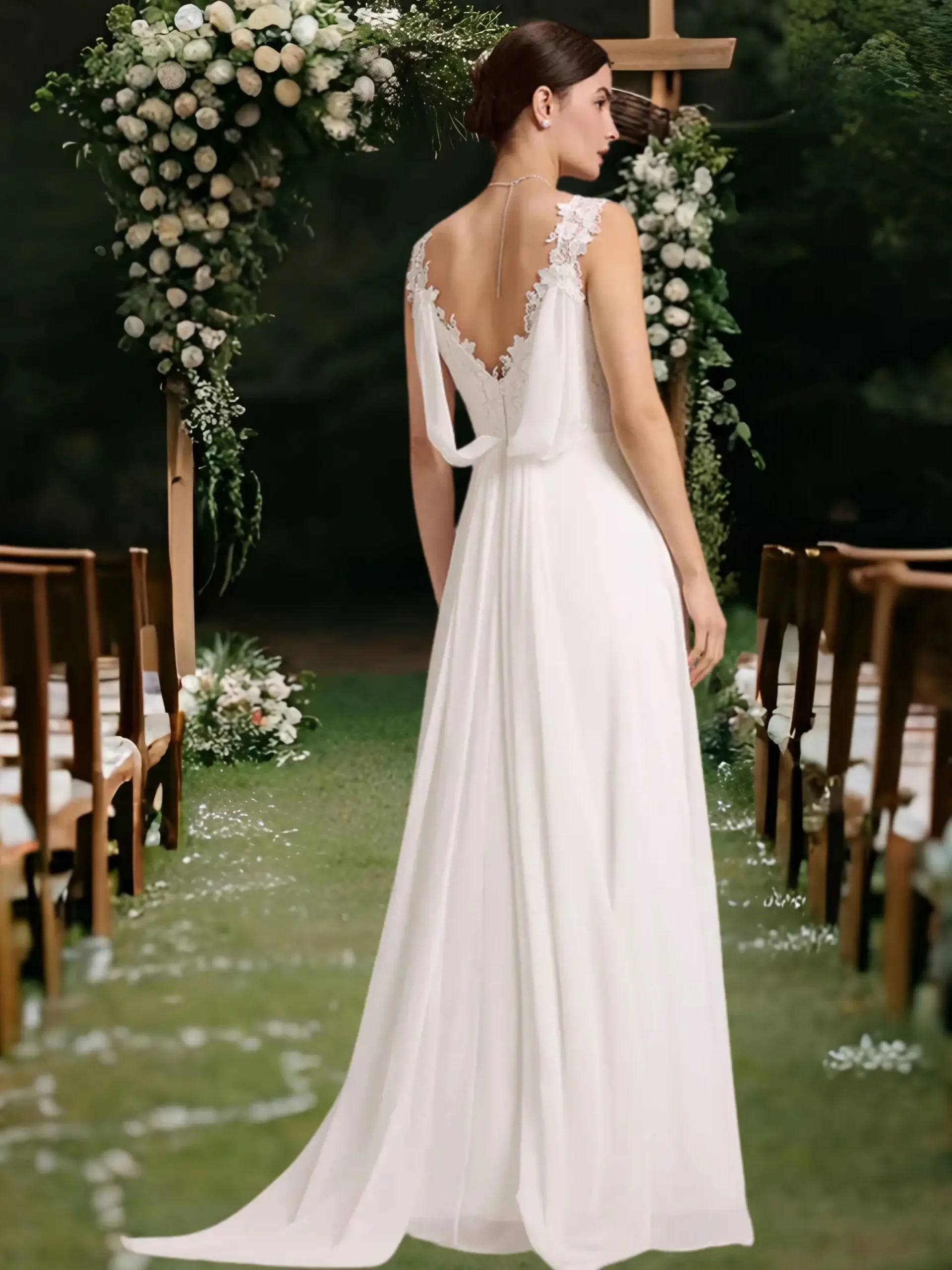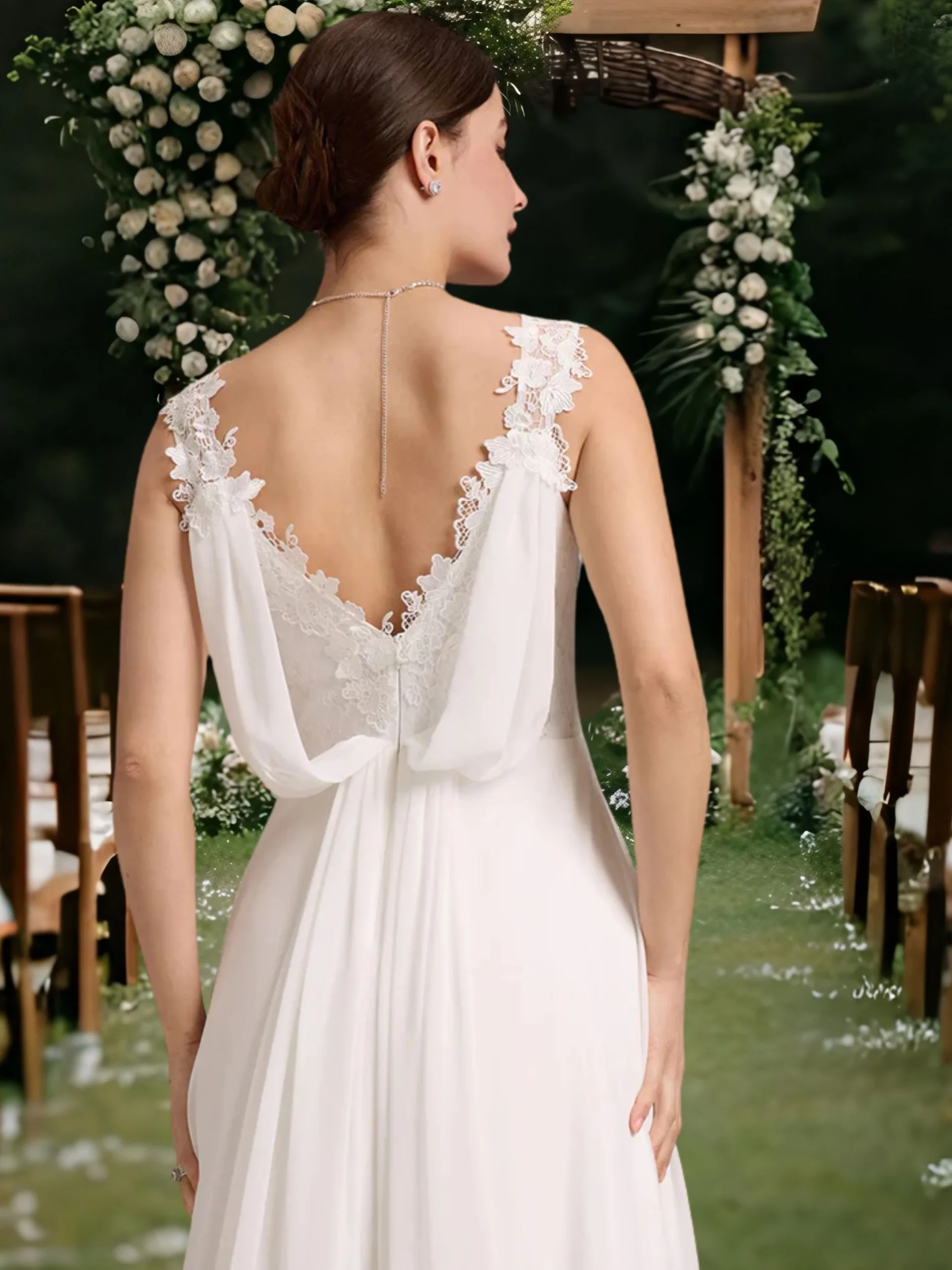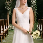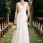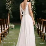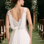 - Ujjatlan, lapockától A-vonalú, visszafogottan csipkés felsőrésszel és hátul uszályos részlettel.