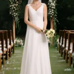 - Letisztult fazonú, V – dekoltált menyasszonyi ruha 42-es méretben készleten.