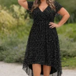 - Aszimmetrikus fazonú duplán V – dekoltált nagyméretű fiatalos alkalmi ruha molett hölgyek számára.