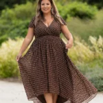 • Aszimmetrikus fazonú duplán V – dekoltált nagyméretű fiatalos alkalmi ruha molett hölgyek számára.