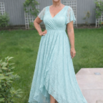 • A ruha térd alá érő hosszúságú, elől rövidebb hátul hosszított dizájn.