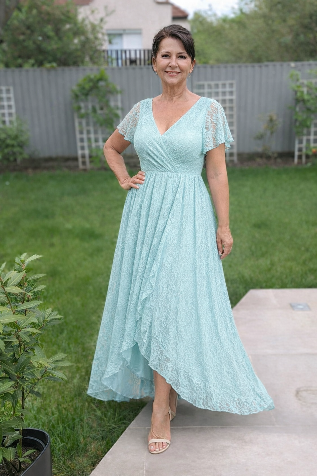 • Midi fazonú csipkés, átlapolt jellegű, alkalmi elegáns ruha.