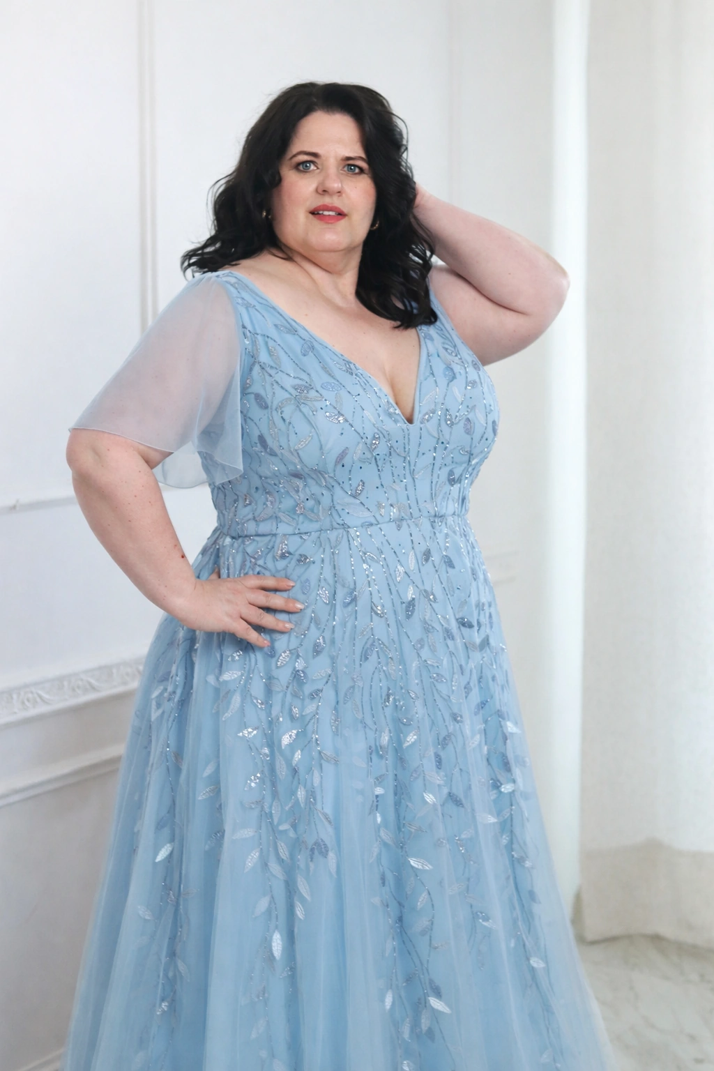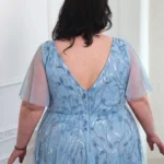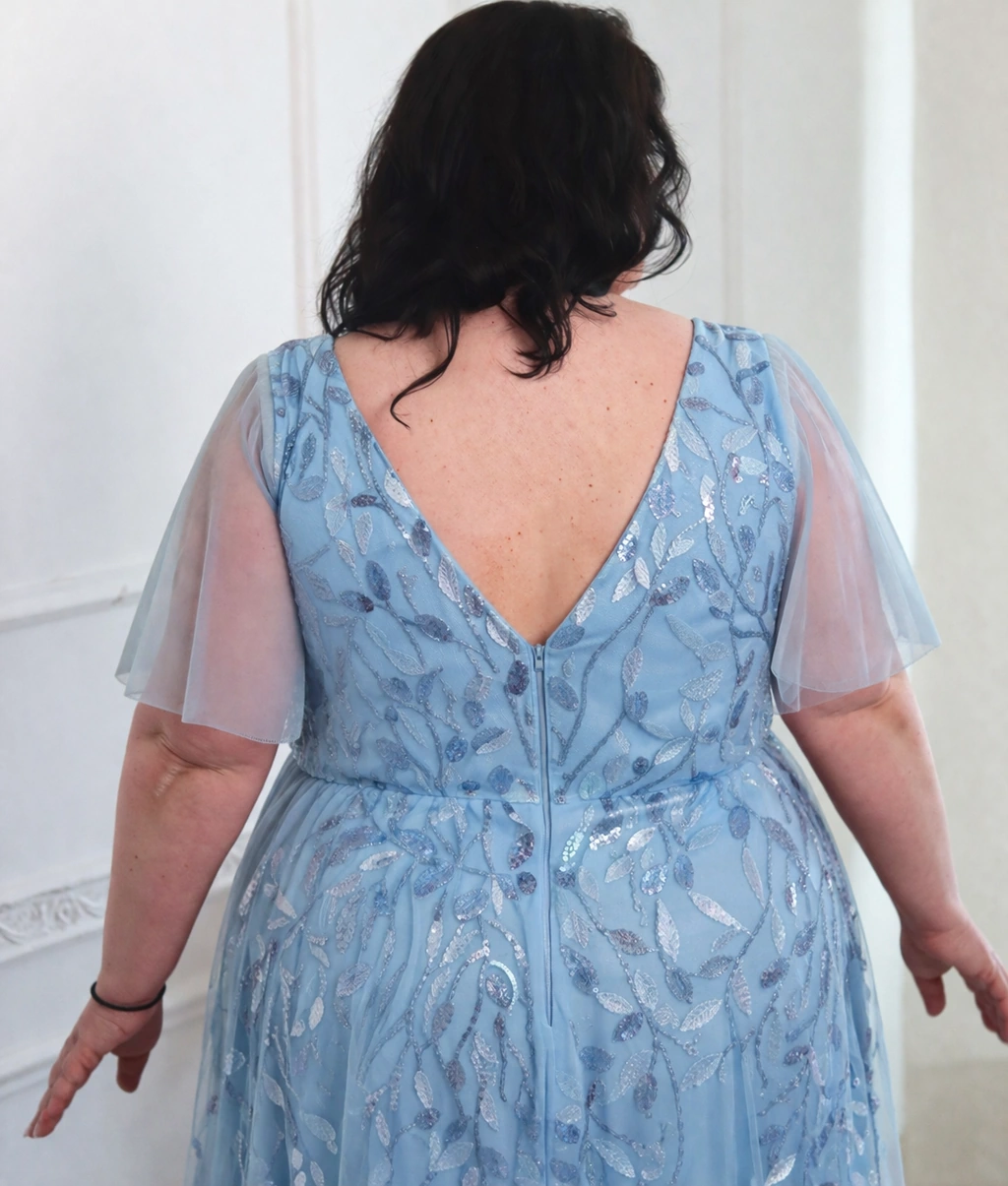 - Ujjai pillangó dizájnúak, a ruha teljes egészét gépi hímzés és apró flitterek borítják.