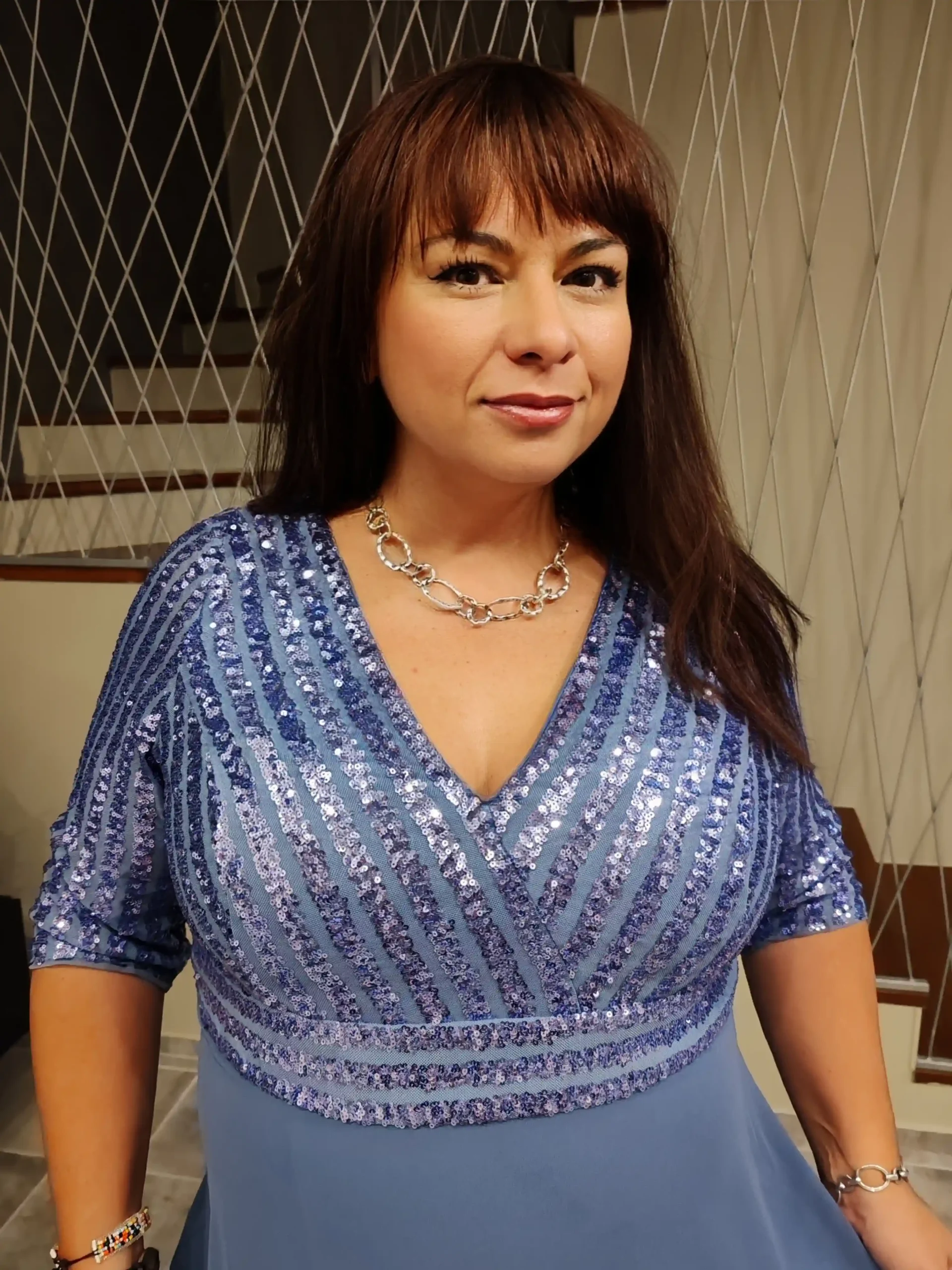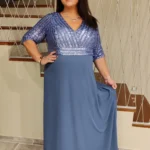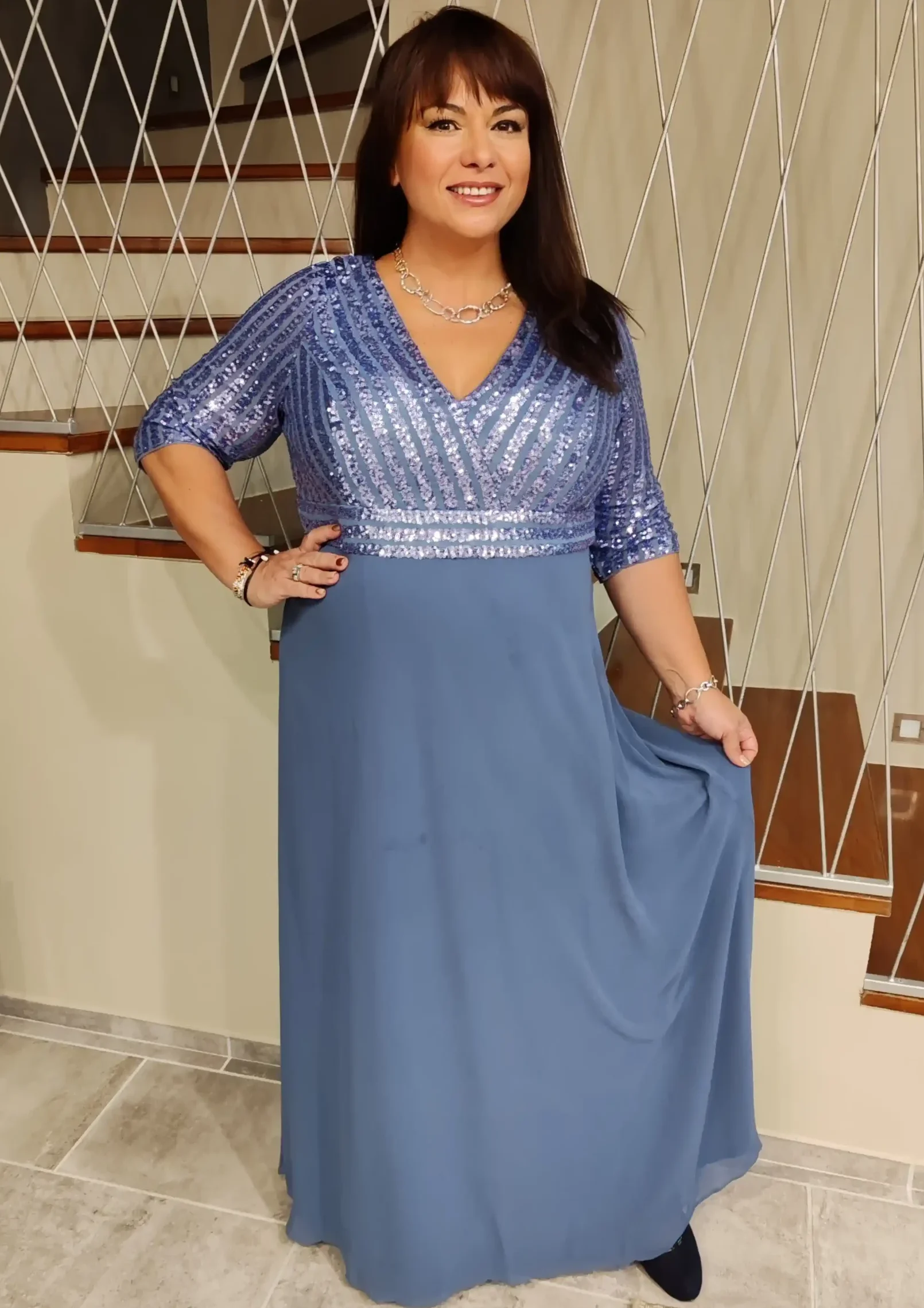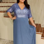 - Maxi fazonú, V – dekoltált, nagyméretű fiatalos alkalmi estélyi ruha, molett hölgyek számára.